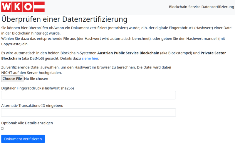 A new verification service has been added to the WKO's (Austrian chamber of commerce) blockchain data certification service - this can be used to check whether and when an electronic document has been certified ("notarized").